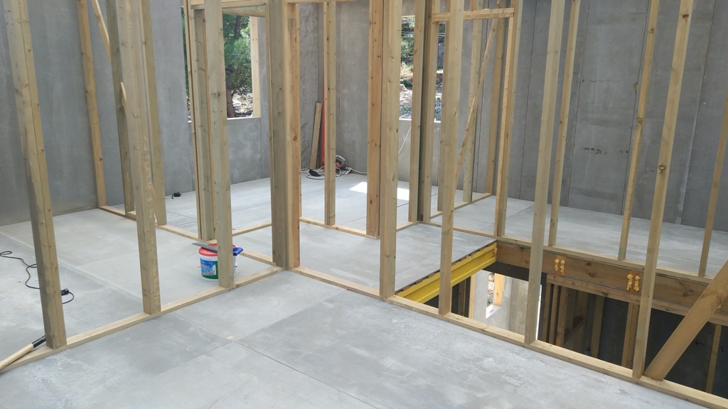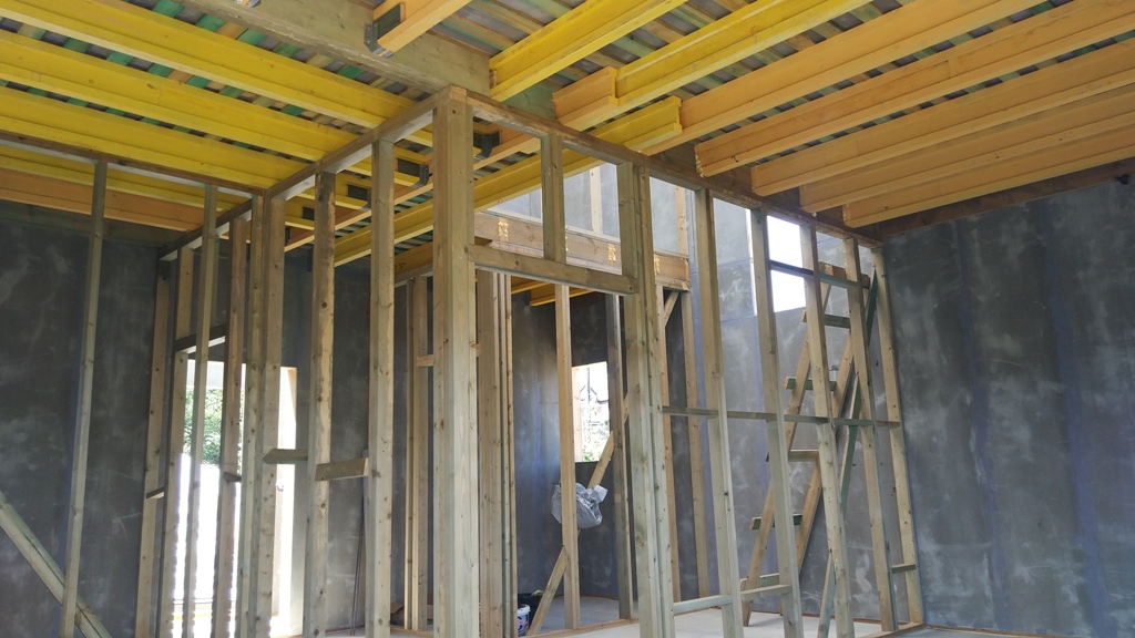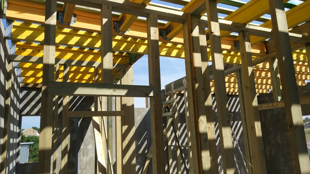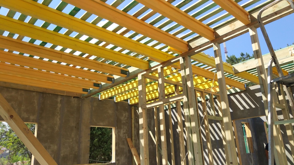 В межэтажных перекрытиях в качестве несущих лаг мы применяем двутавровые балки собственного производства с влагостойкой 24 мм. фанерой в сердечнике.