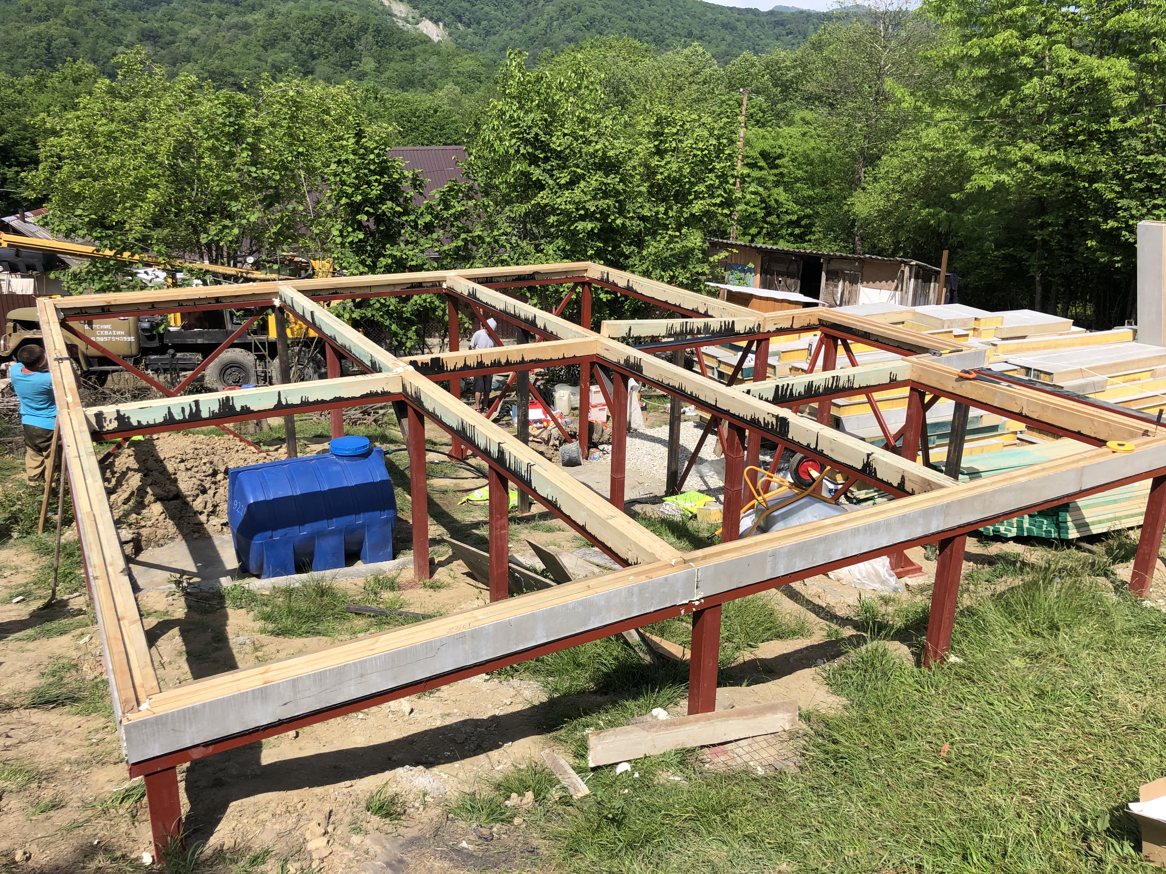 Ростверк изготовлен из калиброванного клееного бруса и защищен снаружи цементно-стружечной плитой