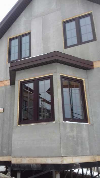 из СИП панелей из ЦСП размером 2700*1200*168 мм с антисептированным калиброванным пиломатериалом камерной сушки (46*140 мм). Монтаж каркасов несущих перегородок из пиломатериала 38*89 мм (76*89 мм).