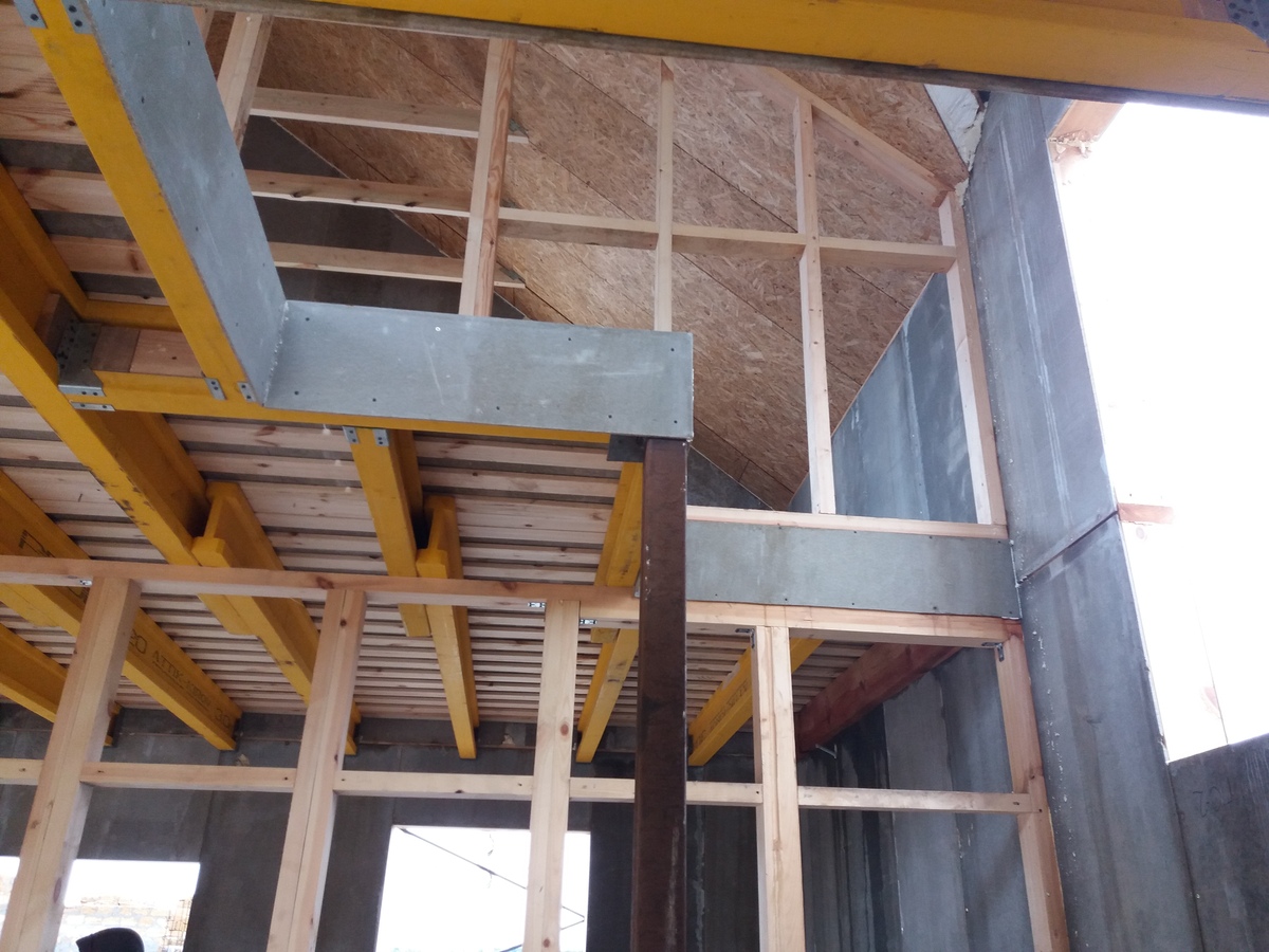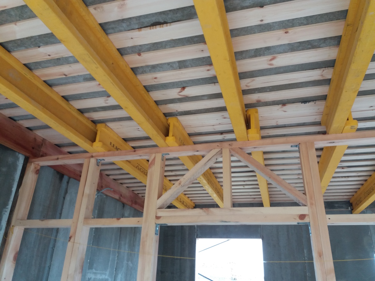 В межэтажных перекрытиях в качестве несущих лаг мы применяем двутавровые балки собственного производства с влагостойкой 24 мм. фанерой в сердечнике.