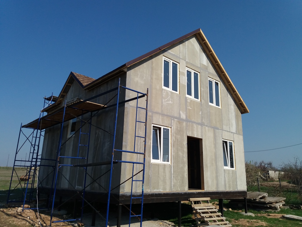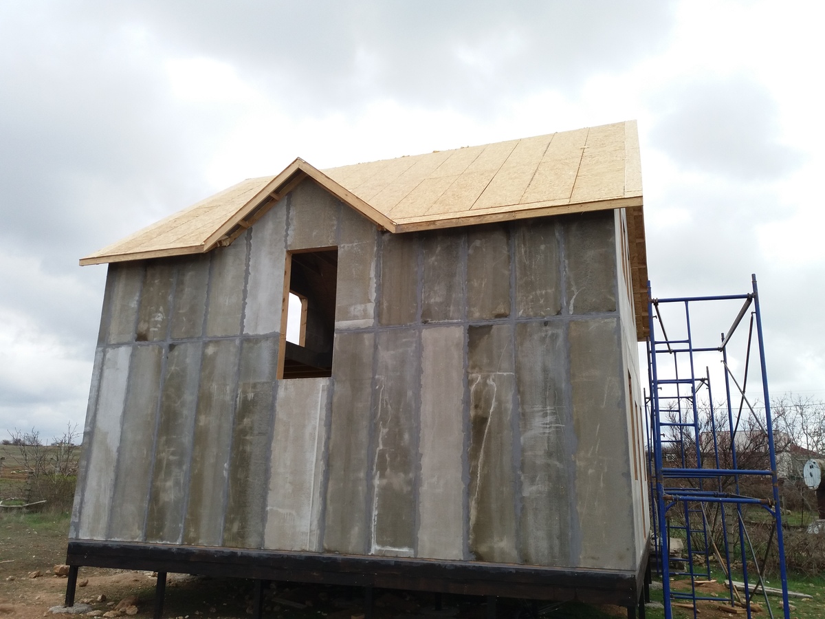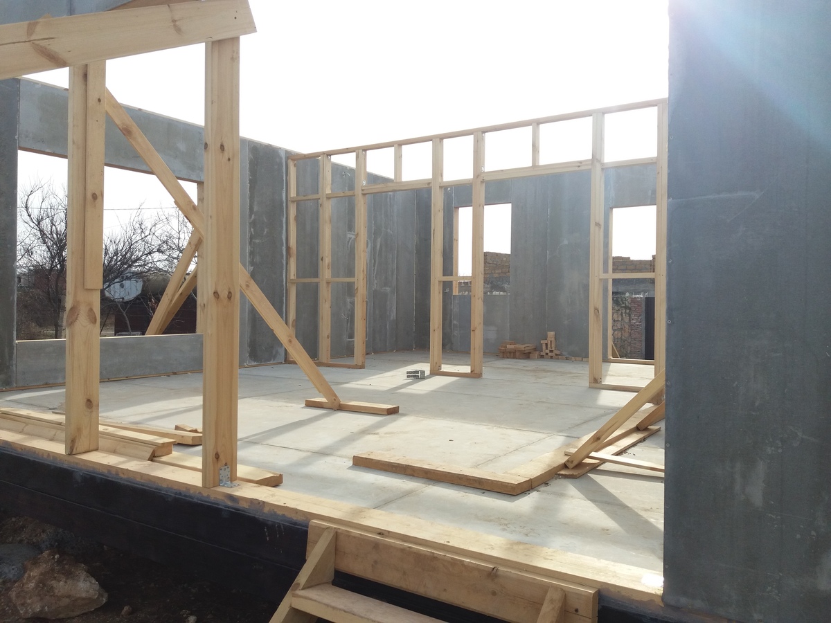 из СИП панелей из ЦСП размером 2700*1200*168 мм с антисептированным калиброванным пиломатериалом камерной сушки (46*140 мм). Монтаж каркасов несущих перегородок из пиломатериала 38*89 мм (76*89 мм).