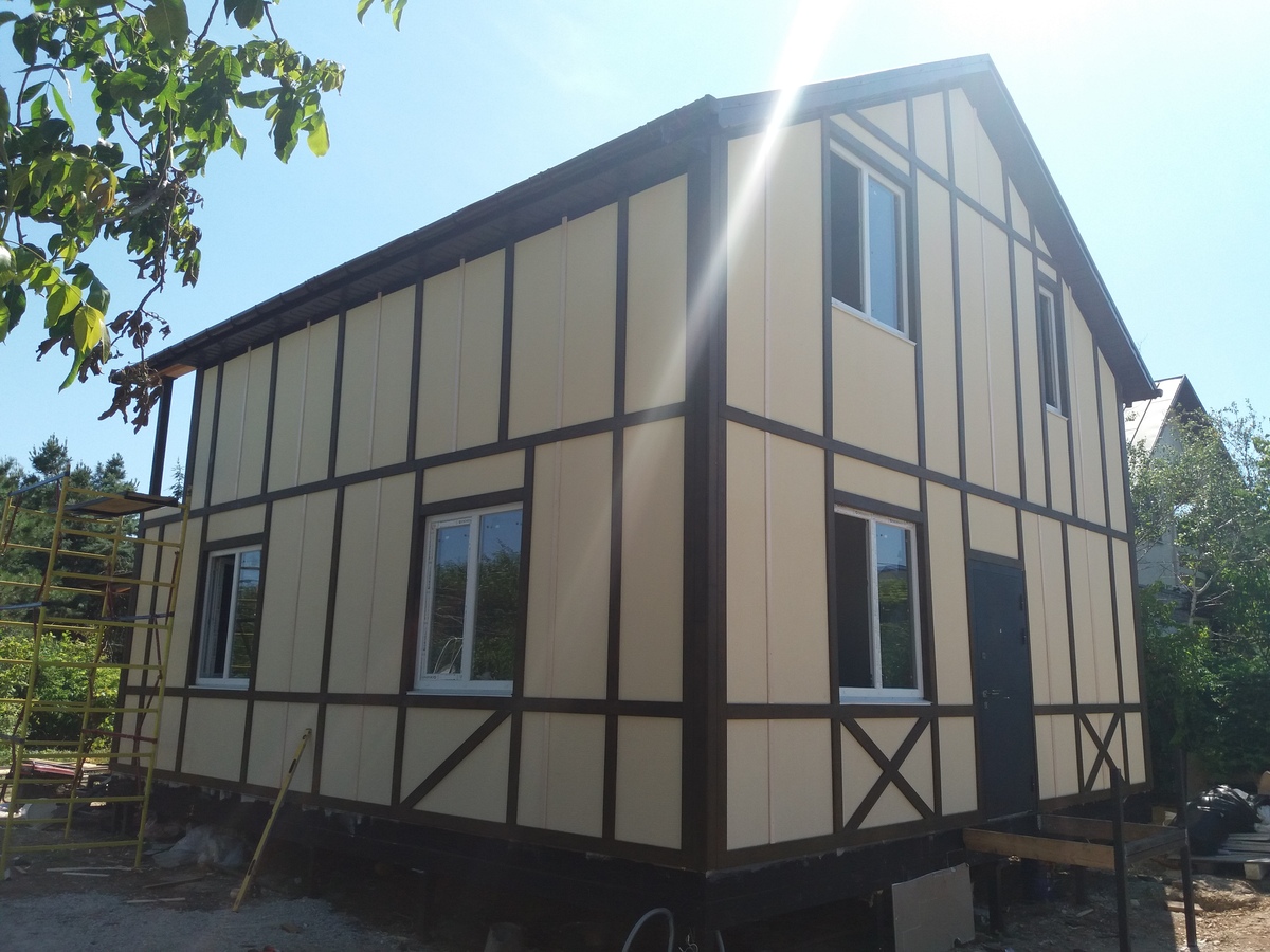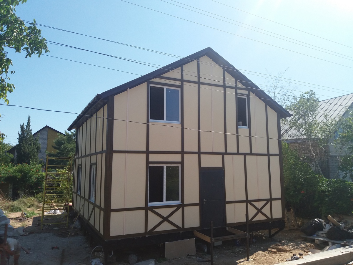 из СИП панелей из ЦСП размером 2700*1200*168 мм с антисептированным калиброванным пиломатериалом камерной сушки (46*140 мм). Монтаж каркасов несущих перегородок из пиломатериала 38*89 мм (76*89 мм).