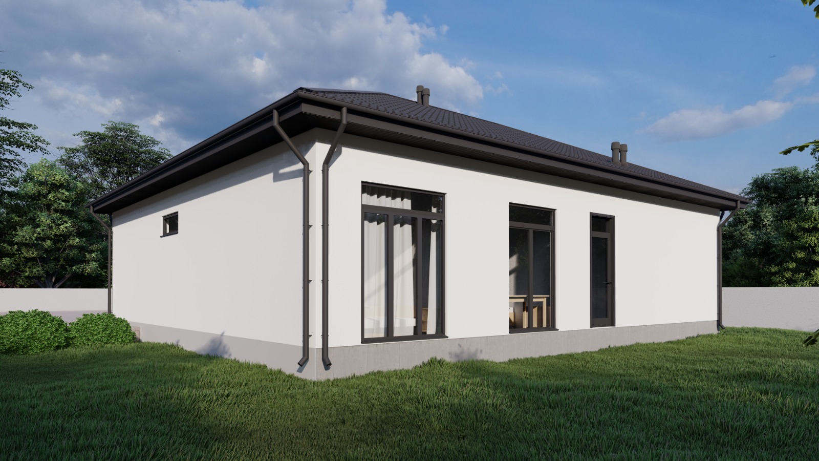 • Плоская или скатная утепленная кровля (пароизоляционная пленка, утеплитель вата на основе стекловолокна или базальта, гидро-ветрозащитная мембрана) с покрытием из металлочерепицы, полимерной мембраны или гибкой черепицы. (цена отличается от выбранного типа) (Ширина карнизного свеса от 30 см. Водосточная система в стоимость не входит